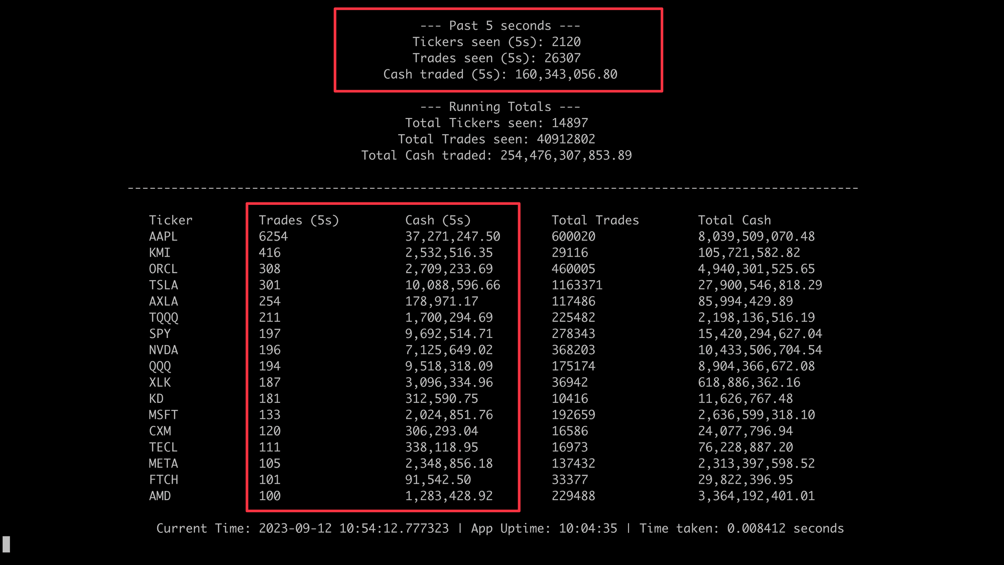 Beyond the immediate 5-second window, the application maintains an ongoing tally termed "Running Totals". This tracks the total number of unique tickers seen since the app started, the grand total of trades, and the cumulative cash value across all these trades. These running totals give users a broader perspective on market activity over time, highlighting the most consistently traded stocks and their cumulative financial impact.